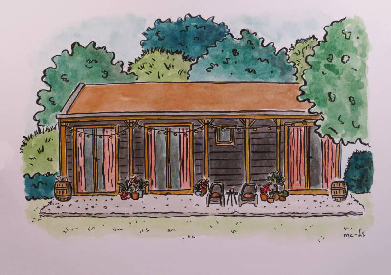 Een huisportret met brushpen is voorzien van zwarte lijnen, dit is de brushpen. De illustratie is altijd ingekleurd met waterverf.